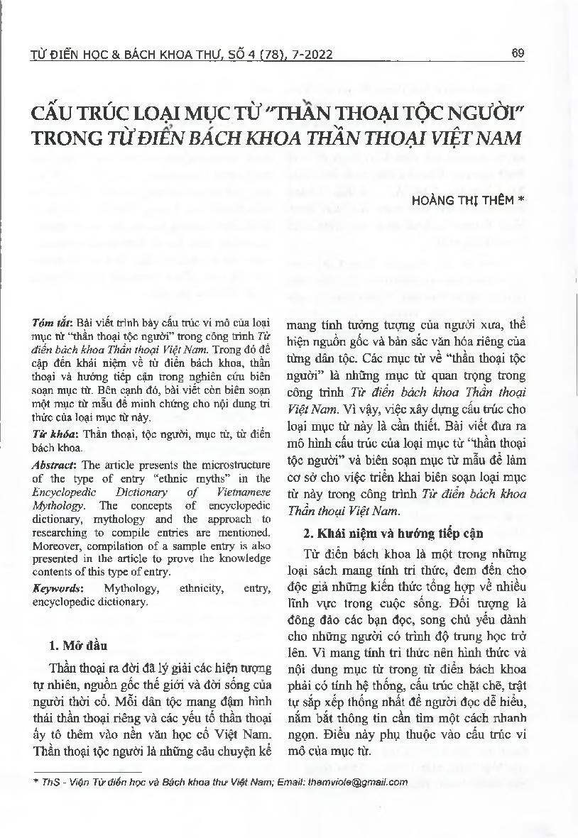 Cấu trúc loại mục từ “thần thoại tộc người” trong Từ điển bách khoa Thần thoại Việt Nam = The structure of the type of entry “ethnic myths” in the Encyclopedic Dictionary of Vietnamese Mythology