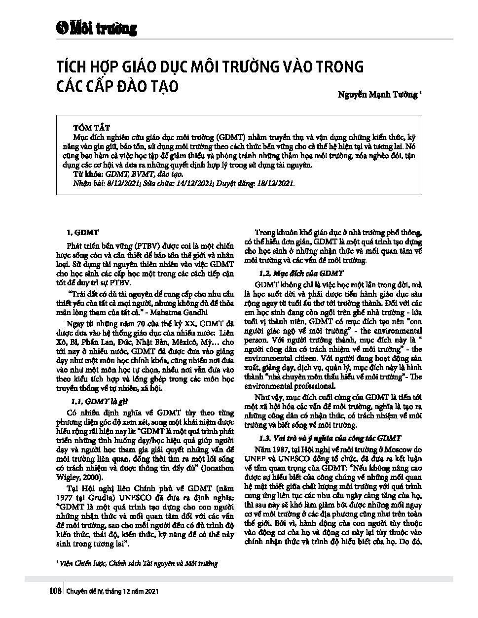 Tích hợp giáo dục môi trường vào trong các cấp đào tạo = Integrating environmental education into training levels