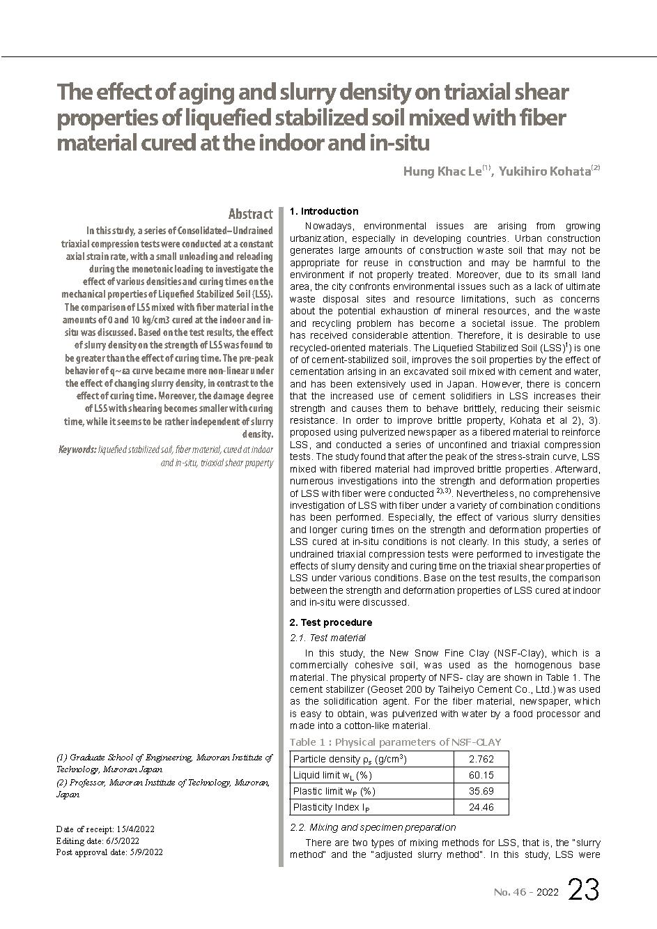 Ảnh hưởng của lão hóa và mật độ vữa đến tính chất chống cắt ba trục của đất ổn định hóa lỏng trộn với vật liệu sợi được xử lý trong nhà và tại chỗ = The effect of aging and slurry density on triaxial shear properties of liquefied stabilized soil mixed wit