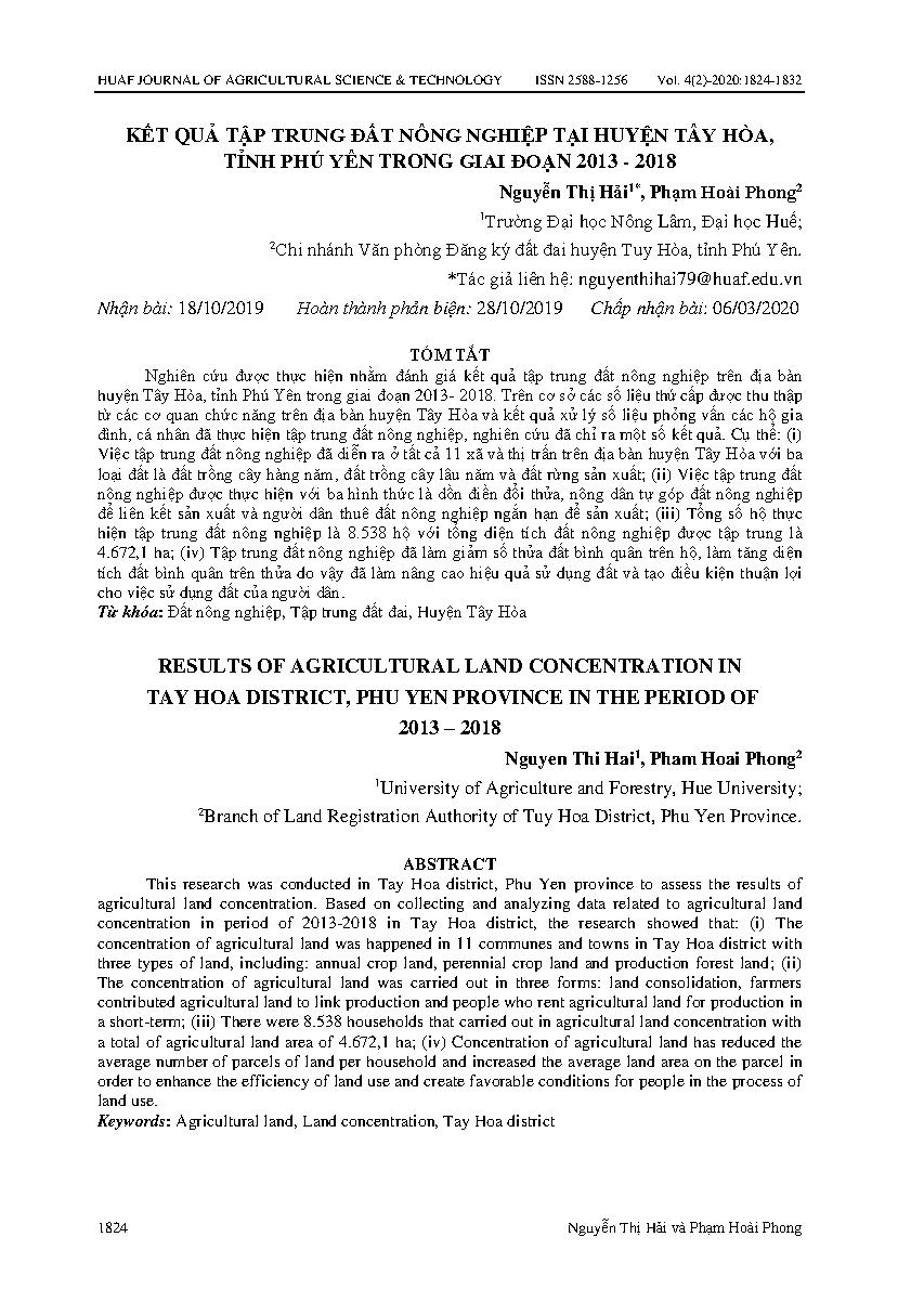 Kết quả tập trung đất nông nghiệp tại huyện Tây Hòa, tỉnh Phú Yên trong giai đoạn 2013 - 2018 = Results of agricultural land concentration in Tay Hoa district, Phu Yen province in the period of 2013 – 2018