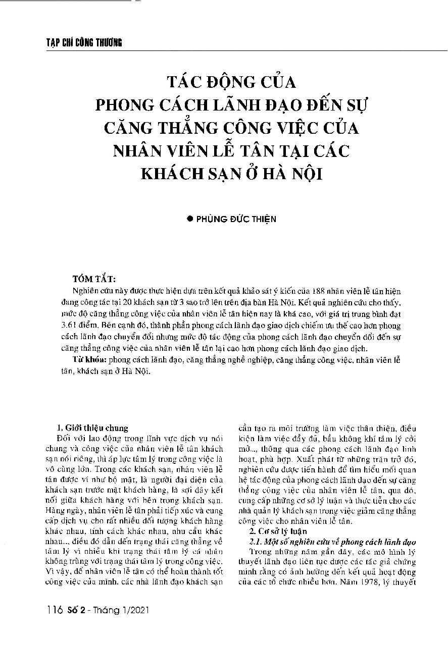 Tác động của phong cách lãnh đạo đến sự căng thẳng công việc của nhân viên lễ tân tại các khách sạn ở Hà Nội = The impacts of leadership style on the work stress of receptionists working at hotels in Hanoi