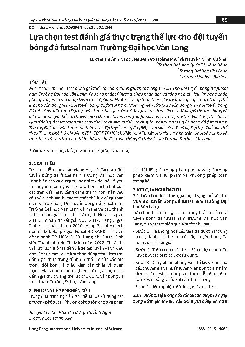 Lựa chọn test đánh giá thực trạng thể lực cho đội tuyển bóng đá futsal nam Trường Đại học Văn Lang = Selecting and testing to evaluate the physical condition of the men's futsal soccer team at Van Lang University