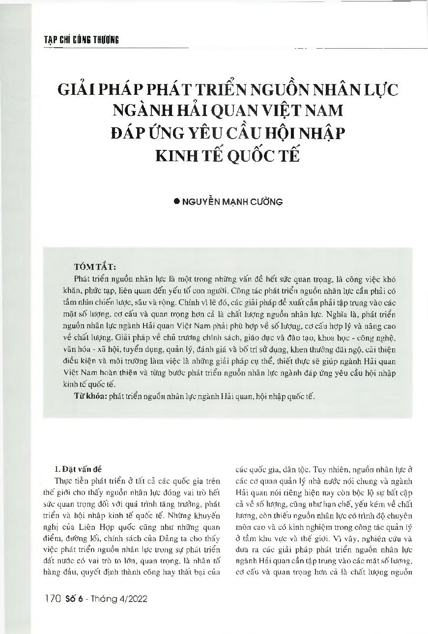 Giải pháp phát triển nguồn nhân lực ngành Hải quan Việt Nam đáp ứng yêu cầu hội nhập kinh tế quốc tế = Solutions for the development of human resources in Vietnam&; 39;s customs sector to meet requirements of the country&; 39;s international economic integr