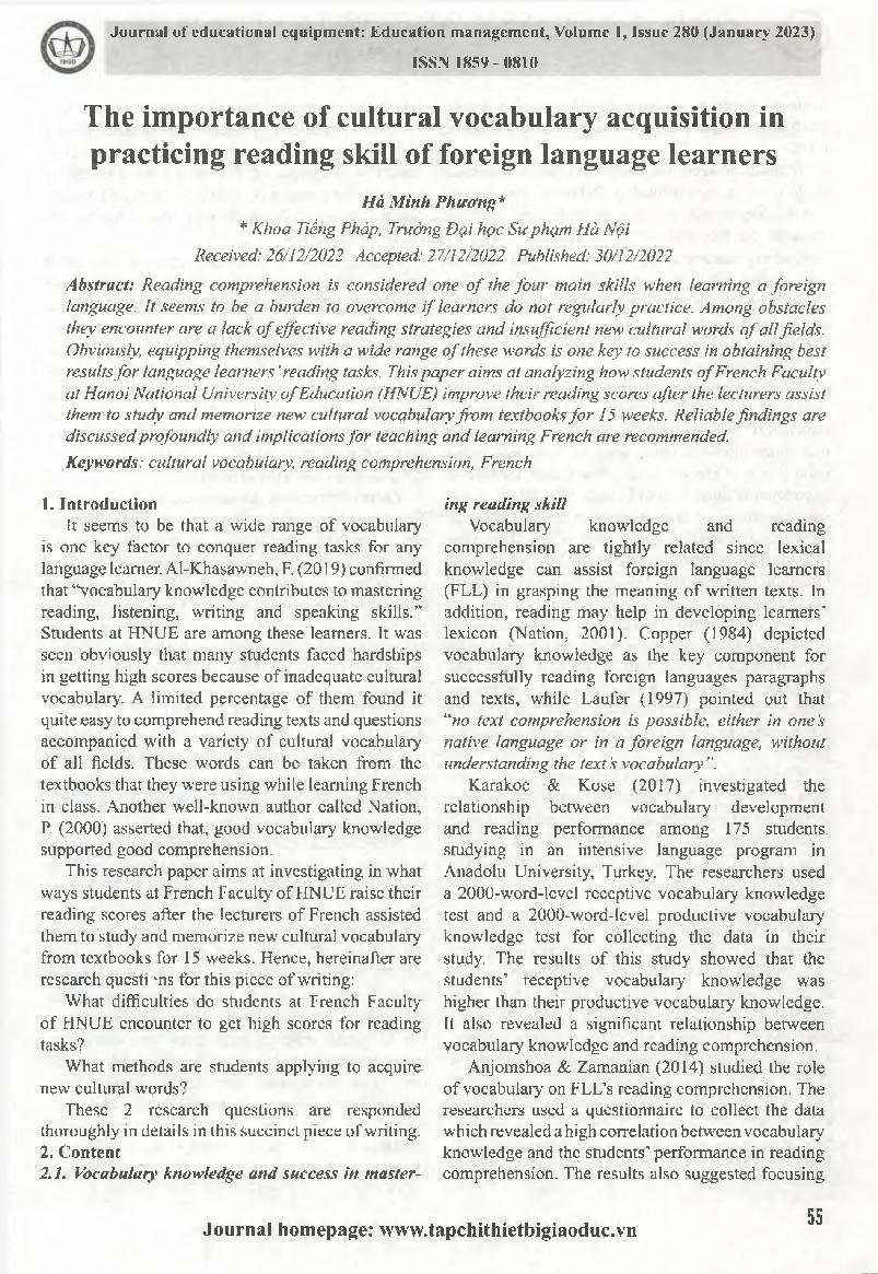 Tầm quan trọng của việc tiếp thu từ vựng văn hóa trong việc rèn luyện kỹ năng đọc của người học ngoại ngữ = The importance of cultural vocabulary acquisition in practicing reading skill of foreign language learners