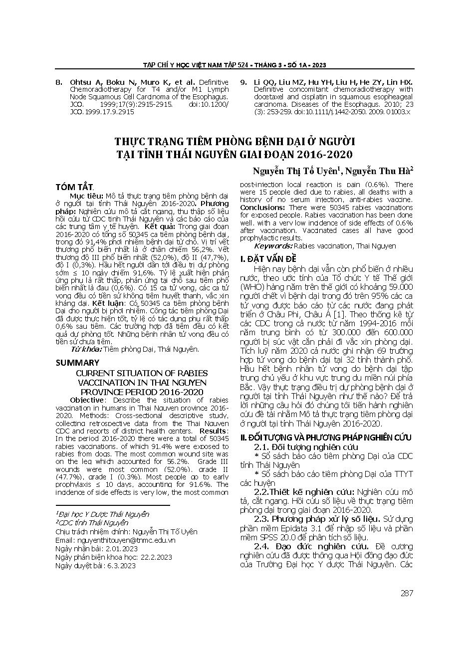 Thực trạng tiêm phòng bệnh dại ở người tại tỉnh Thái Nguyên giai đoạn 2016-2020 = Current situation of rabies vaccination in Thai Nguyen province period 2016-2020