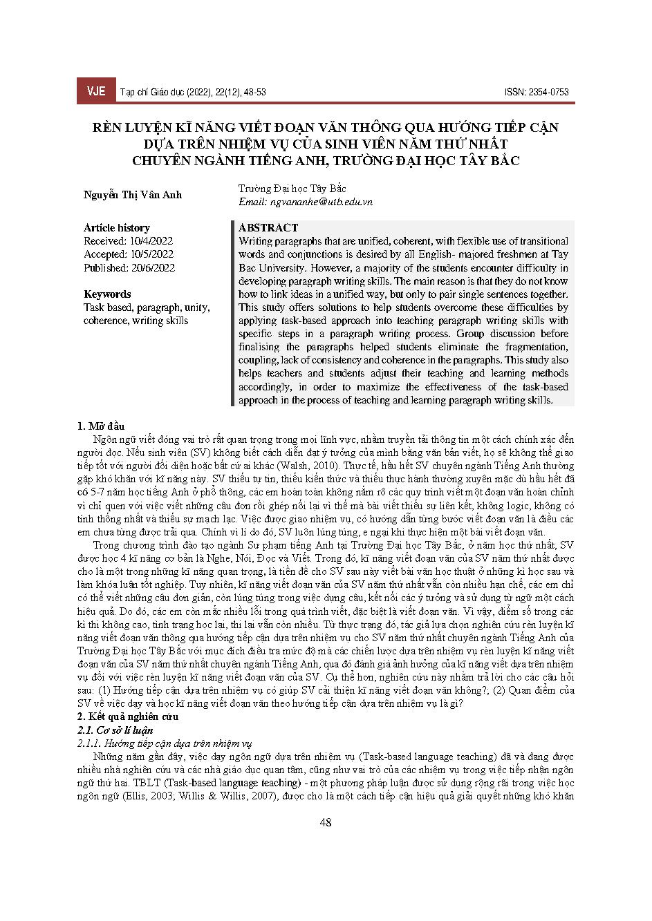 Rèn luyện kĩ năng viết đoạn văn thông qua hướng tiếp cận dựa trên nhiệm vụ của sinh viên năm thứ nhất chuyên ngành tiếng Anh, Trường Đại học Tây Bắc = Practice paragraph writing skills through a task-based approach of first-year English majors, Northweste