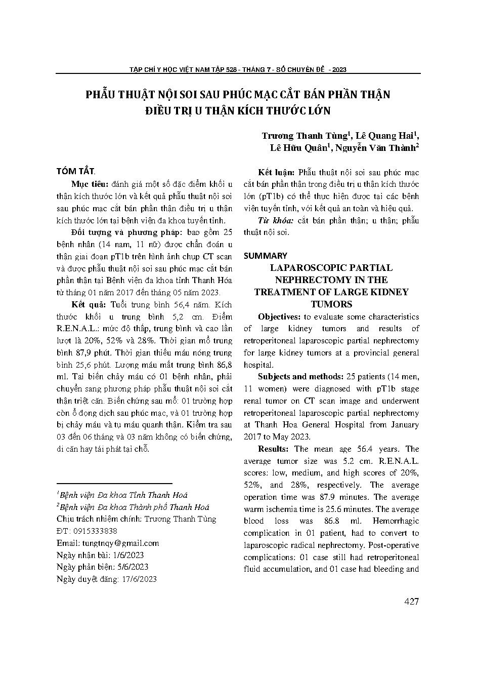 Phẫu thuật nội soi sau phúc mạc cắt bán phần thận điều trị u thận kích thước lớn