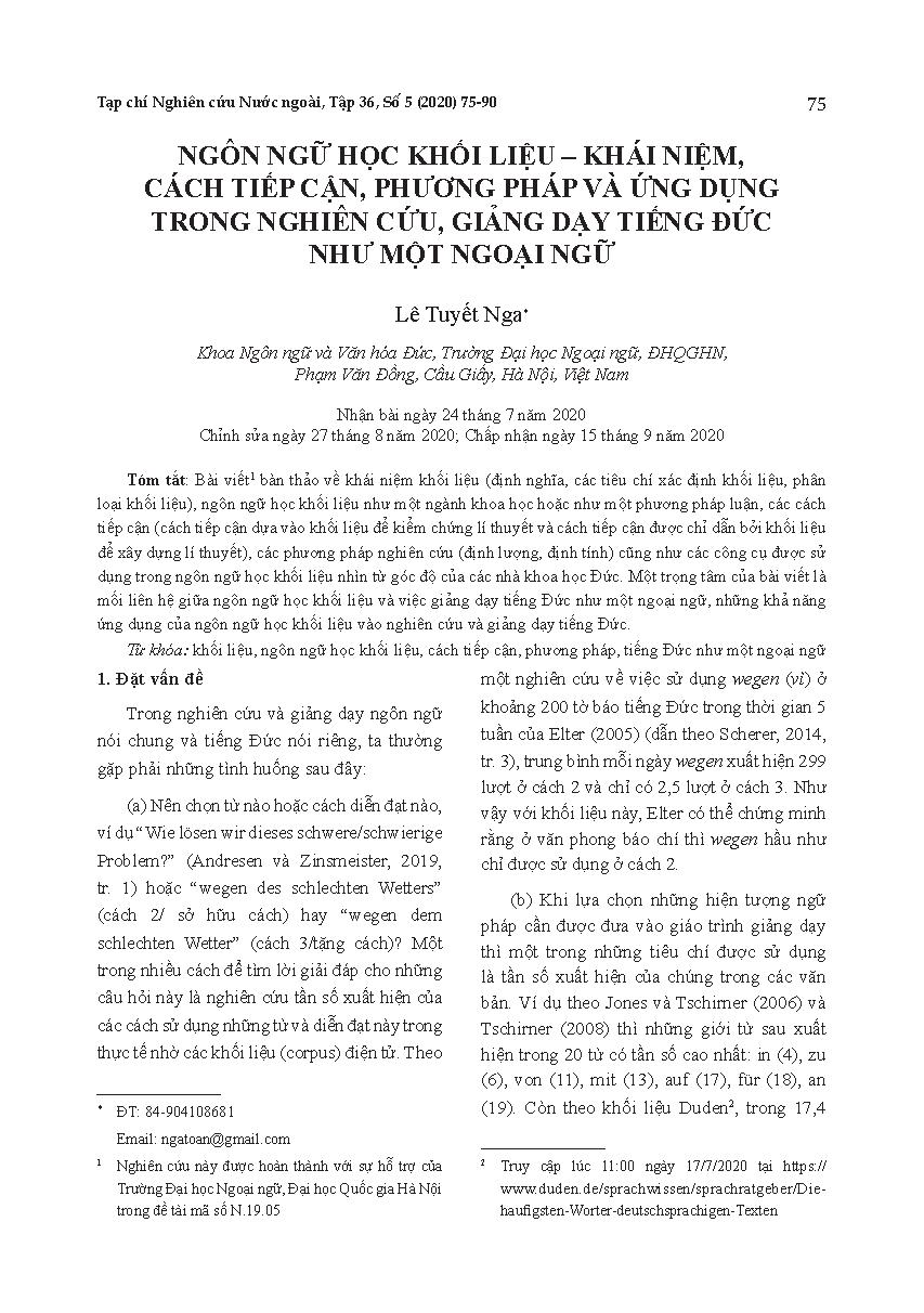 Ngôn ngữ học khối liệu – khái niệm, cách tiếp cận, phương pháp và ứng dụng trong nghiên cứu, giảng dạy tiếng đức như một ngoại ngữ = Corpus linguistics – concept, approaches, methods and applications in research and teaching of German as a foreign language