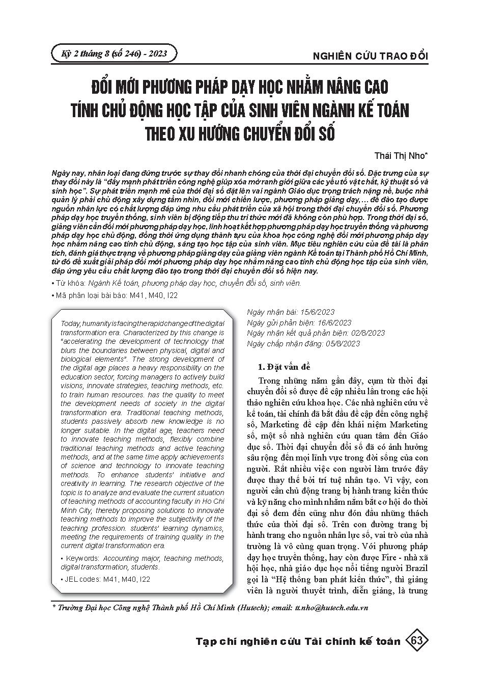 Đổi mới phương pháp dạy học nhằm nâng cao tính chủ động học tập của sinh viên ngành Kế toán theo xu hướng chuyển đổi số = Innovating teaching methods to enhance students' proactive learning in accounting in the context of digital transformation