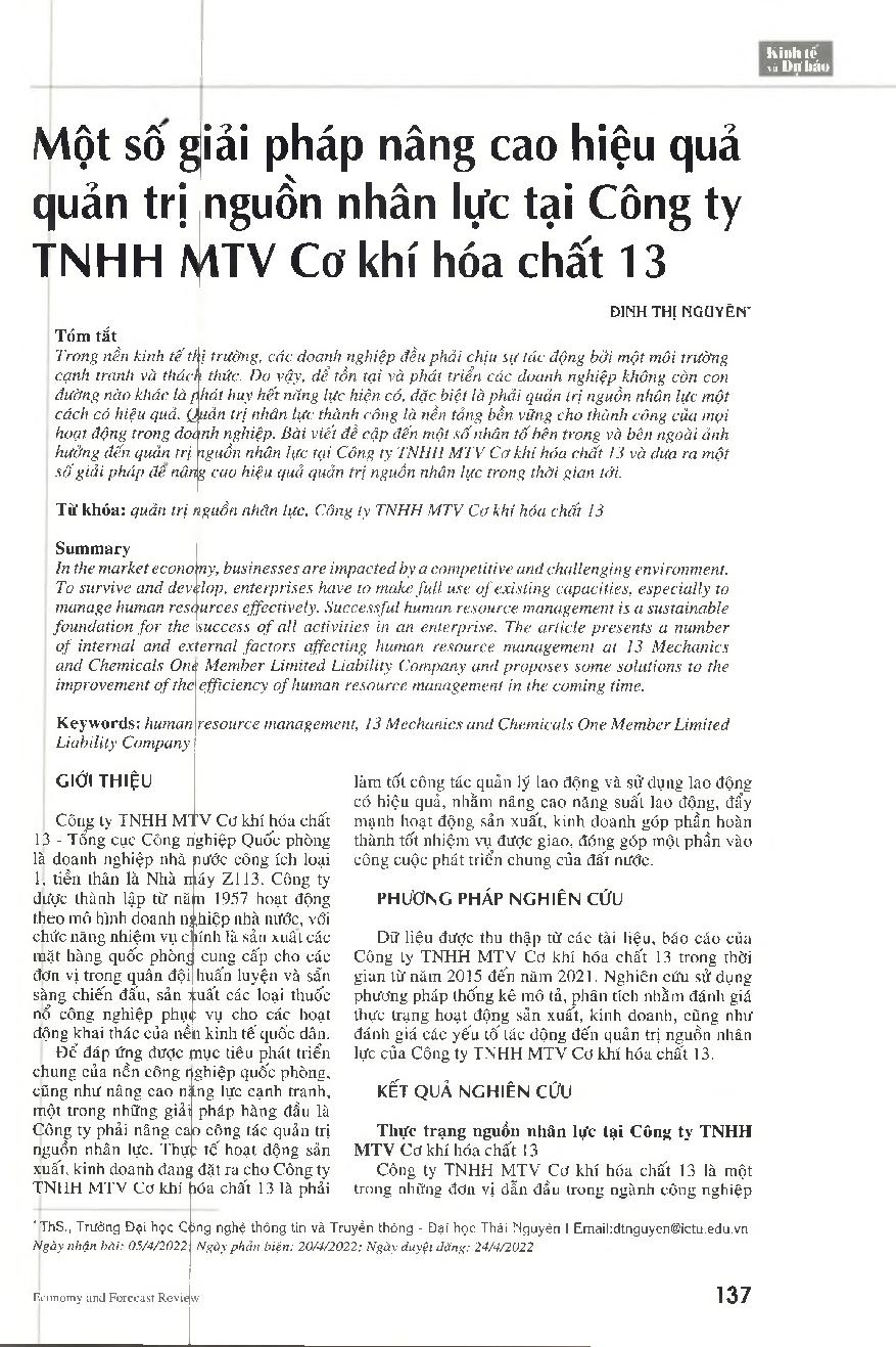 Một số giải pháp nâng cao hiệu quả quản trị nguồn nhân lực tại Công ty TNHH MTV Cơ khí hóa chất 13 = Some solutions to improve the efficiency of human resource management at 13 Mechanics and Chemicals One Member Limited Liability Company