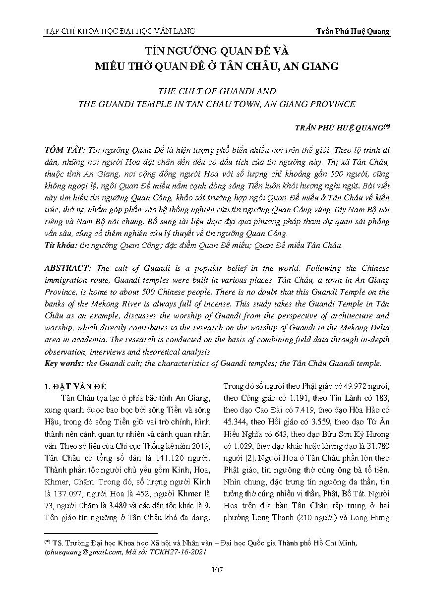 Tín ngưỡng quan đế và miếu thờ quan đế ở Tân Châu, An Giang = The cult of Guandi and the Guandi temple in Tan Chau town, An Giang province