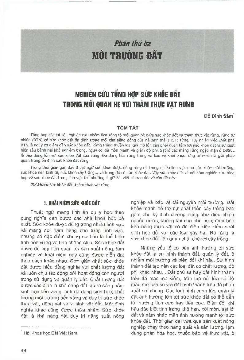 Nghiên cứu tổng hợp sức khỏe đất trong mối quan hệ với thảm thực vật rừng = Integrated study of soil heath in relation to forest vegetation