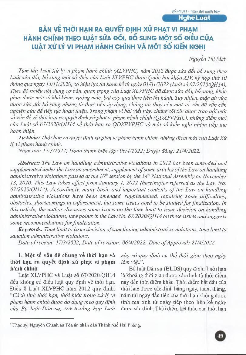 Bàn về thời hạn ra quyết định xử phạt vi phạm hành chinh theo Luật sửa đổi, bổ sung một số điều của Luật Xừ lý vi phạm hành chính và một số kiến nghị = Discussion on the time limit to issue decision to impose sanction for administrative violations under t