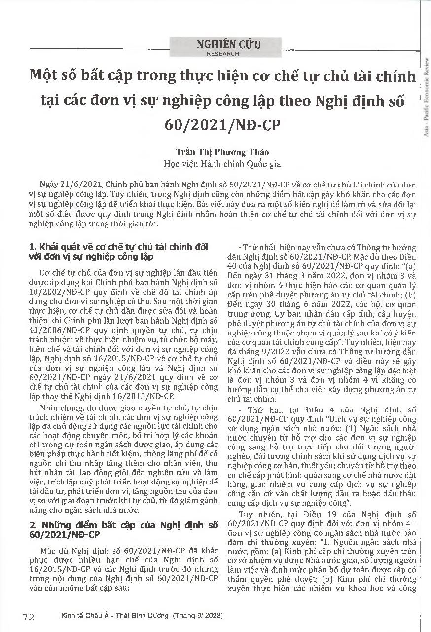 Một số bất cập trong thực hiện CO’ chế tự chủ tài chính tại các đo-n vị sự nghiệp công lập theo Nghị định số 60/2021/NĐ-CP