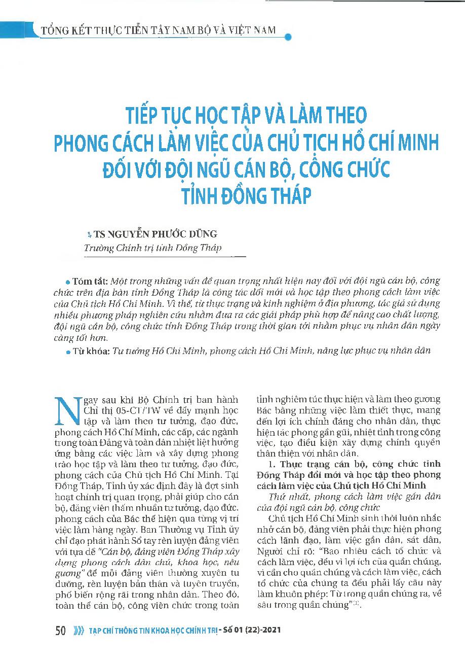 Tiếp tục học tập và làm theo phong cách làm việc của chủ tịch Hồ Chí Minh đối với đội ngũ cán bộ, công chức tỉnh đồng tháp