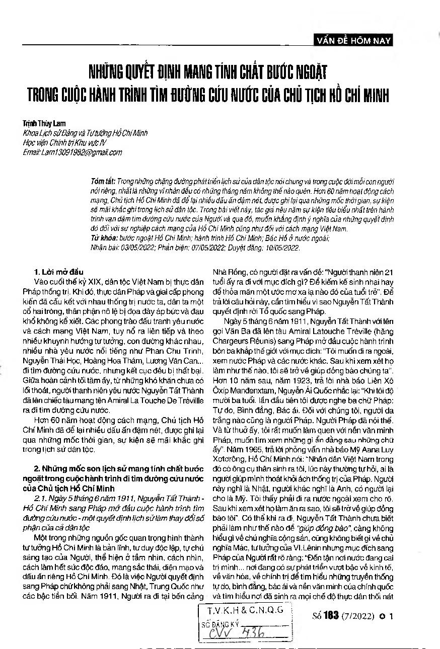 Những quyết định mang tính chất bước ngoặt trong cuộc hành trình tìm đường cứu nước của Chủ tịch Hồ Chí Minh = The landmark decisions hl President Ho Chi Minh&; 39;s journey to find the way to save the country