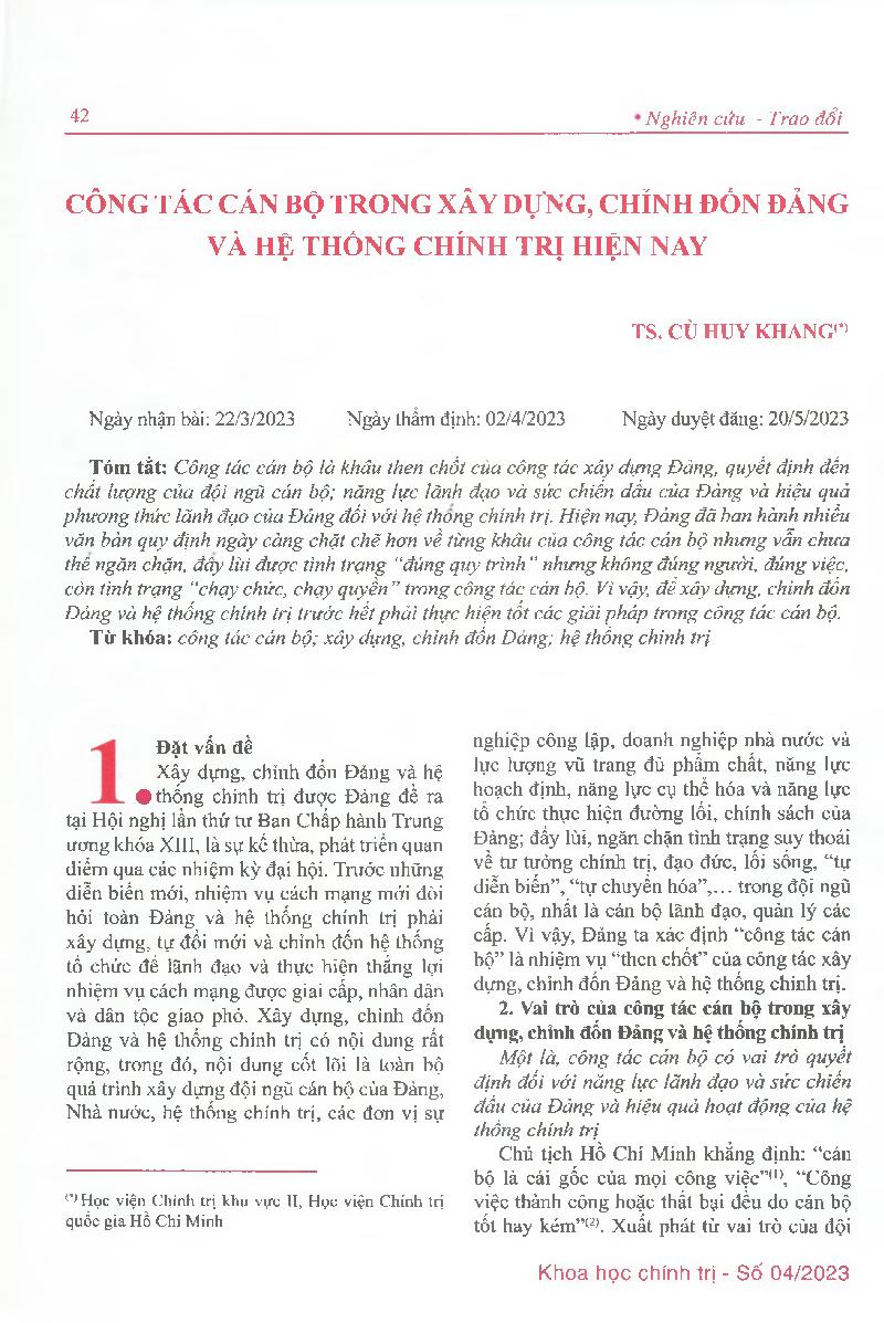 Công tác cán bộ trong xây dựng, chỉnh đốn Đảng và hệ thống chính trị hiện nay