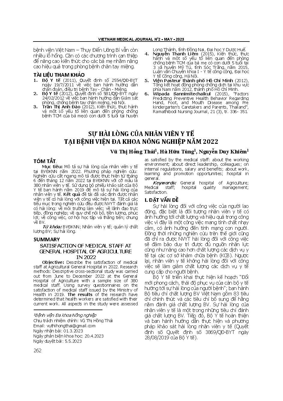 Sự hài lòng của nhân viên y tế tại Bệnh viện Đa khoa Nông nghiệp năm 2022 = Satisfaction of medical staff at general hospital of agriculture in 2022