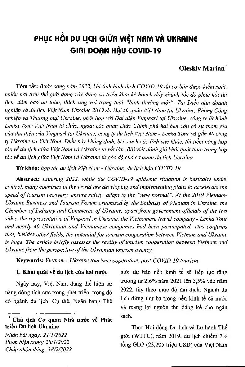 Phục hồi du lịch giữa Việt Nam và Ukraine giai đoạn hậu COVID-19 = Recovery of tourism cooperation between Vietnam and Ukraine in the post-COVID-19 period