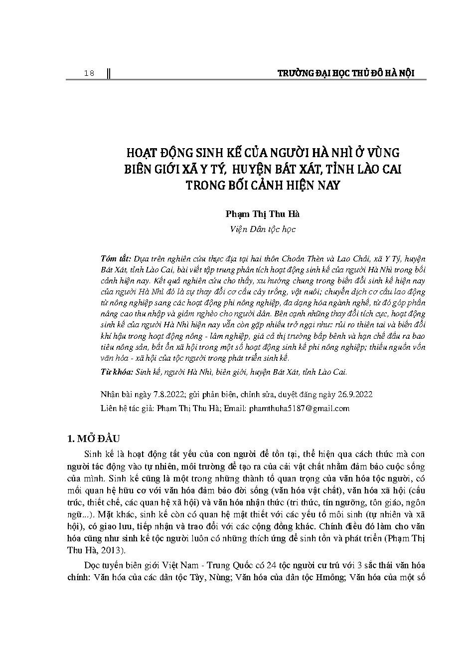 Hoạt động sinh kế của người Hà Nhì ở vùng biên giới xã Y Tý, huyện Bát Xát, tỉnh Lào Cai trong bối cảnh hiện nay = The current situation of life activities of Ha Nhi people in border regions in Y Ty commune, Bat Xat district, Lao Cai province