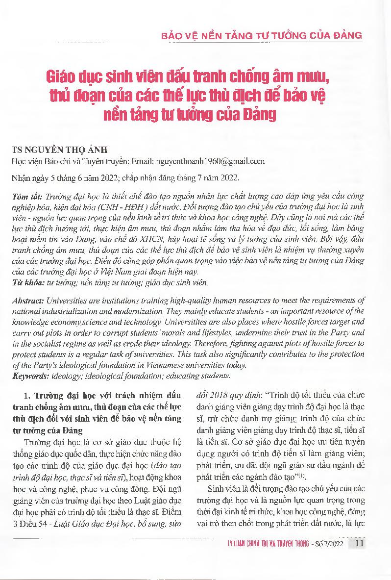 Giáo dục sinh viên đấu tranh chống âm mưu, thủ đoạn của các thế lực thù địch để bảo vệ nền tảng tư tưởng của Đảng