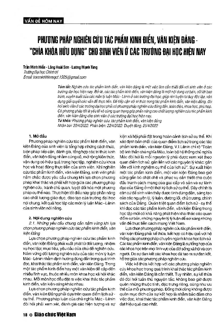Phương pháp nghiên cứu tác phẩm kinh điển, văn kiện Đảng - "Chìa khóa hữu dụng" cho sinh viên ở các trường đại học hiện nay = Methods of studying classical worts and Party documents - An useful key for university students today