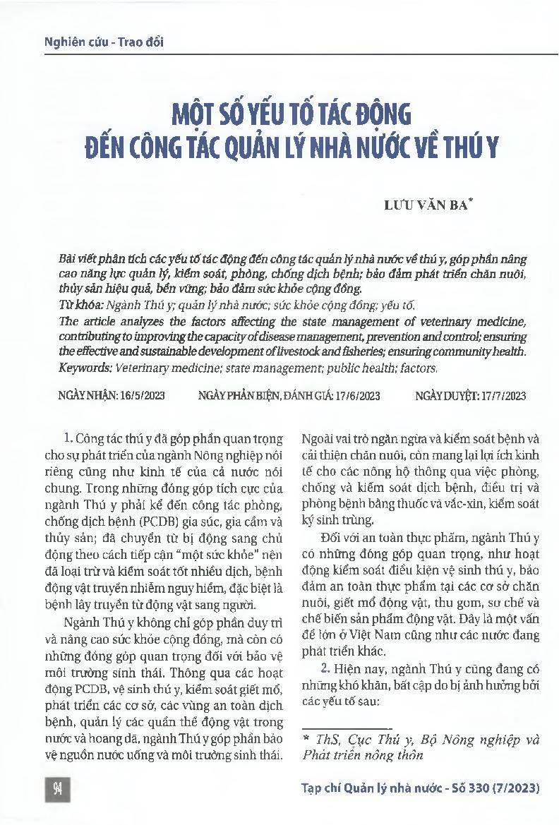 Một số yếu tố tác động đến công tác quản lý nhà nước về thú y = Some factors affecting state management of veterinary medicine