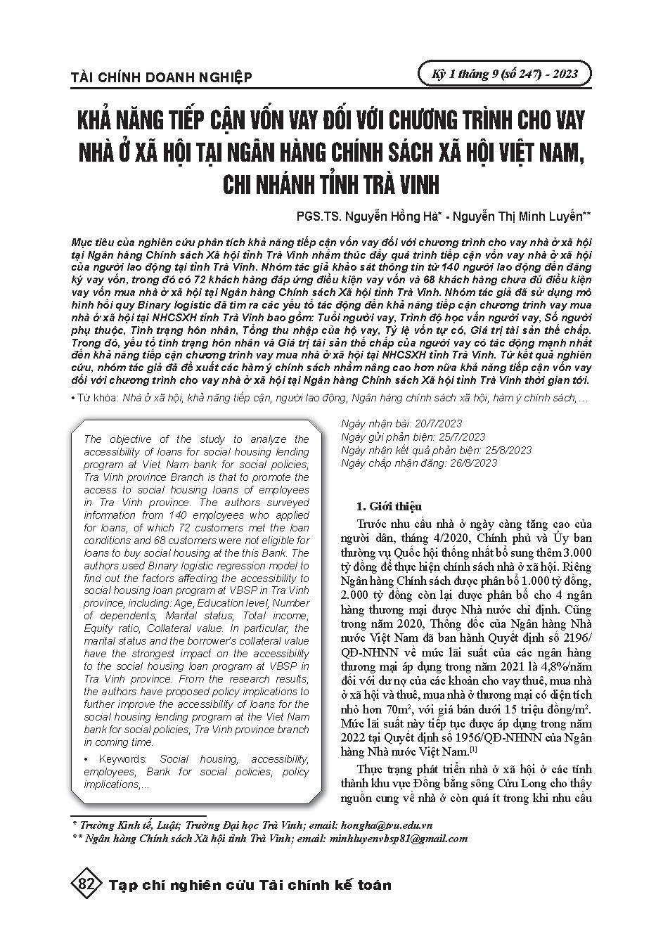 Khả năng tiếp cận vốn vay đối với chương trình cho vay nhà ở xã hội tại Ngân hàng Chính sách Xã hội Việt Nam, chi nhánh tỉnh Trà Vinh = Accessibility to loans for social housing program at Vietnam bank for Social Policies, Tra Vinh branch