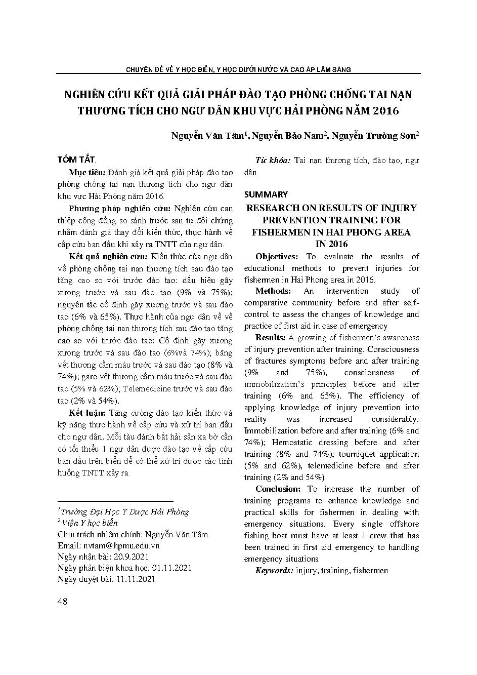 Nghiên cứu kết quả giải pháp đào tạo phòng chống tai nạn thương tích cho ngư dân khu vực Hải Phòng năm 2016