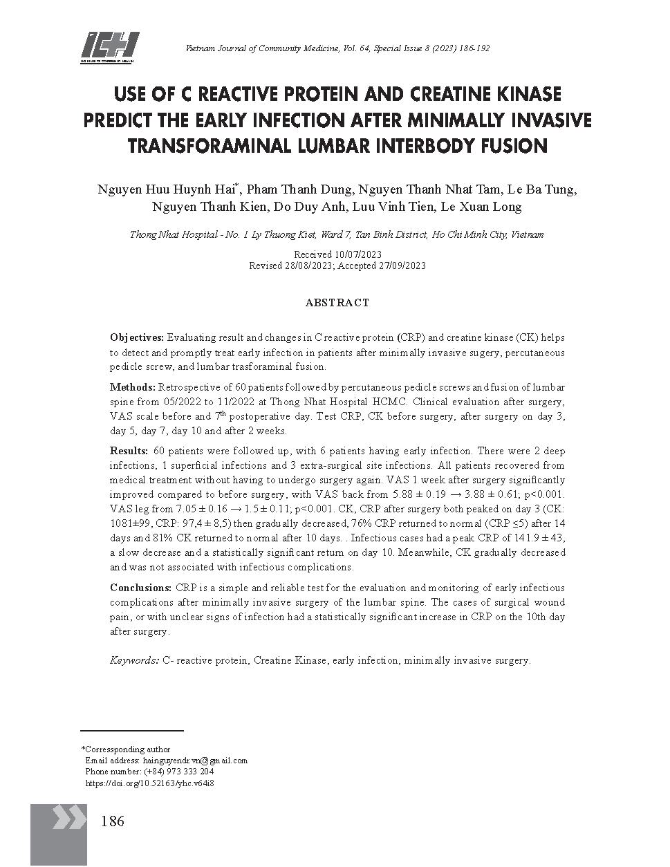 Sử dụng C Reactive Protein và Creatine Kinase dự đoán biến chứng nhiễm trùng sớm sau phẫu thuật xâm lấn tối thiểu hàn xương liên thân đốt cột sống thắt lưng
