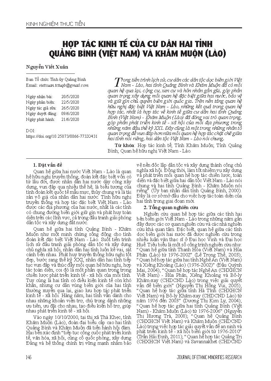 Hợp tác kinh tế của cư dân hai tỉnh Quảng Bình (Việt Nam) và Khăm Muộn (Lào) = Economic cooperation between residents of Quang Binh province (Vietnam) and Kham Muon province (Laos)