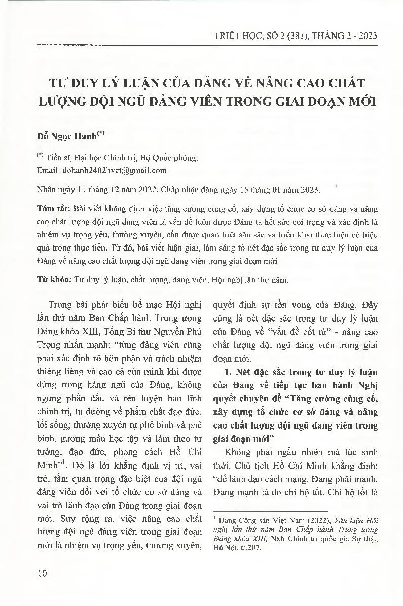 Tư duy lý luận của Đảng về nâng cao chất lượng đội ngũ đảng viên trong giai đoạn mới