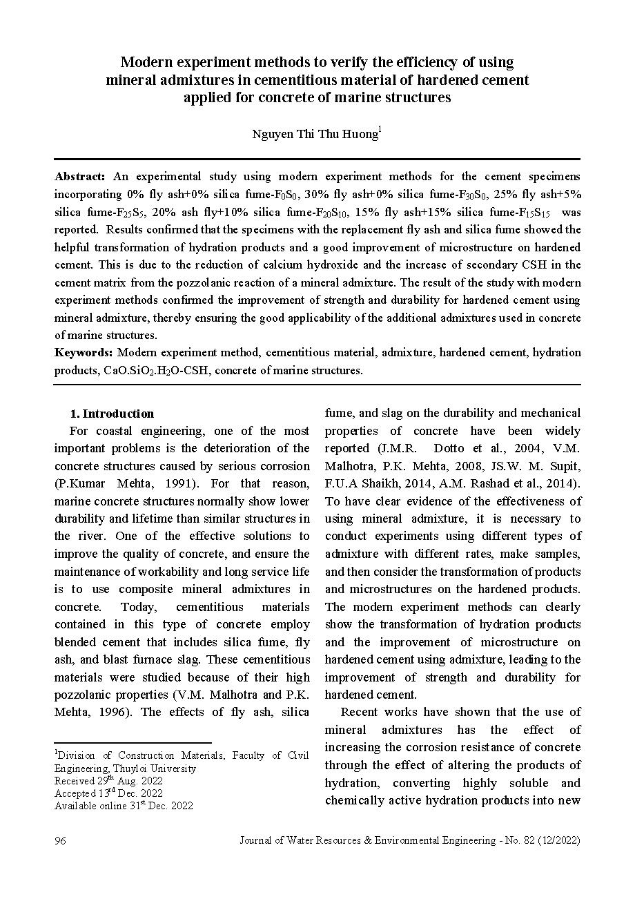 Phương pháp thí nghiệm hiện đại kiểm chứng hiệu quả sử dụng phụ gia khoáng trong vật liệu xi măng đóng rắn áp dụng cho bê tông công trình biển = Modern experiment methods to verify the efficiency of using mineral admixtures in cementitious material of har