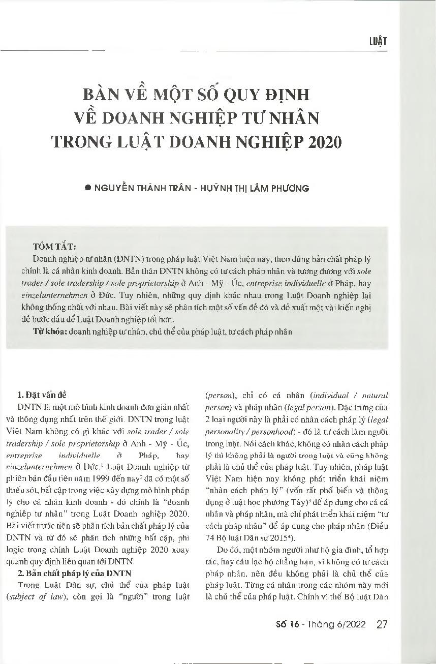 Bàn về một số quy định về doanh nghiệp tư nhân trong Luật Doanh nghiệp 2020 = Discussing some provisions on the private enterprise in the Law on Enterprise 2020