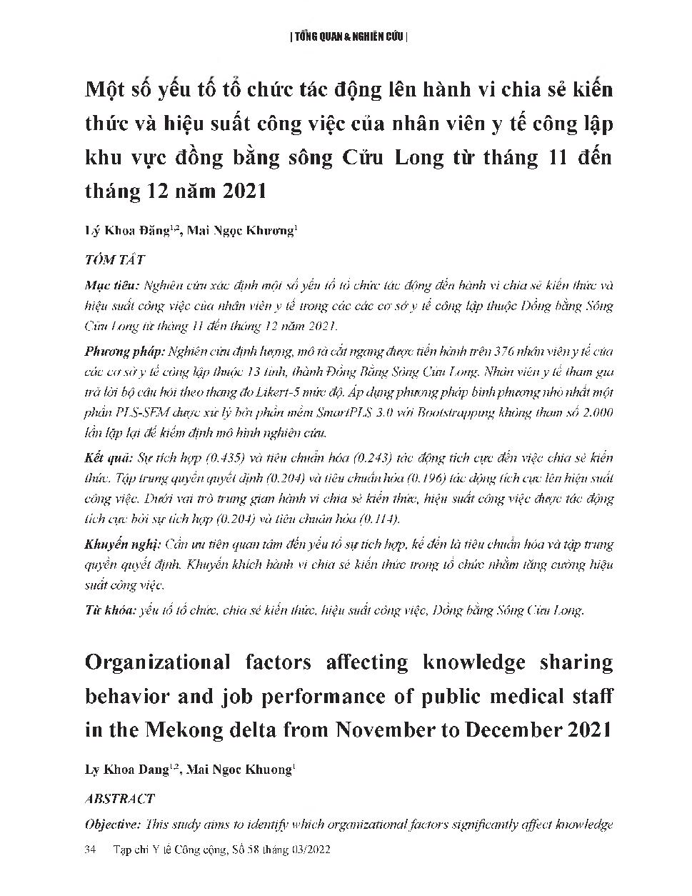 Một số yếu tố tổ chức tác động lên hành vi chia sẻ kiến thức và hiệu suất công việc của nhân viên y tế công lập khu vực đồng bằng sông Cửu Long từ tháng 11 đến tháng 12 năm 2021 = Organizational factors affecting knowledge sharing behavior and job perform