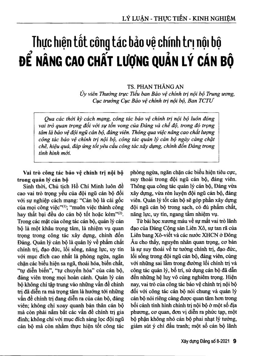 Thực hiện tốt công tác bảo vệ chính trí nội bộ để nâng cao chất lượng quản lý cán bộ