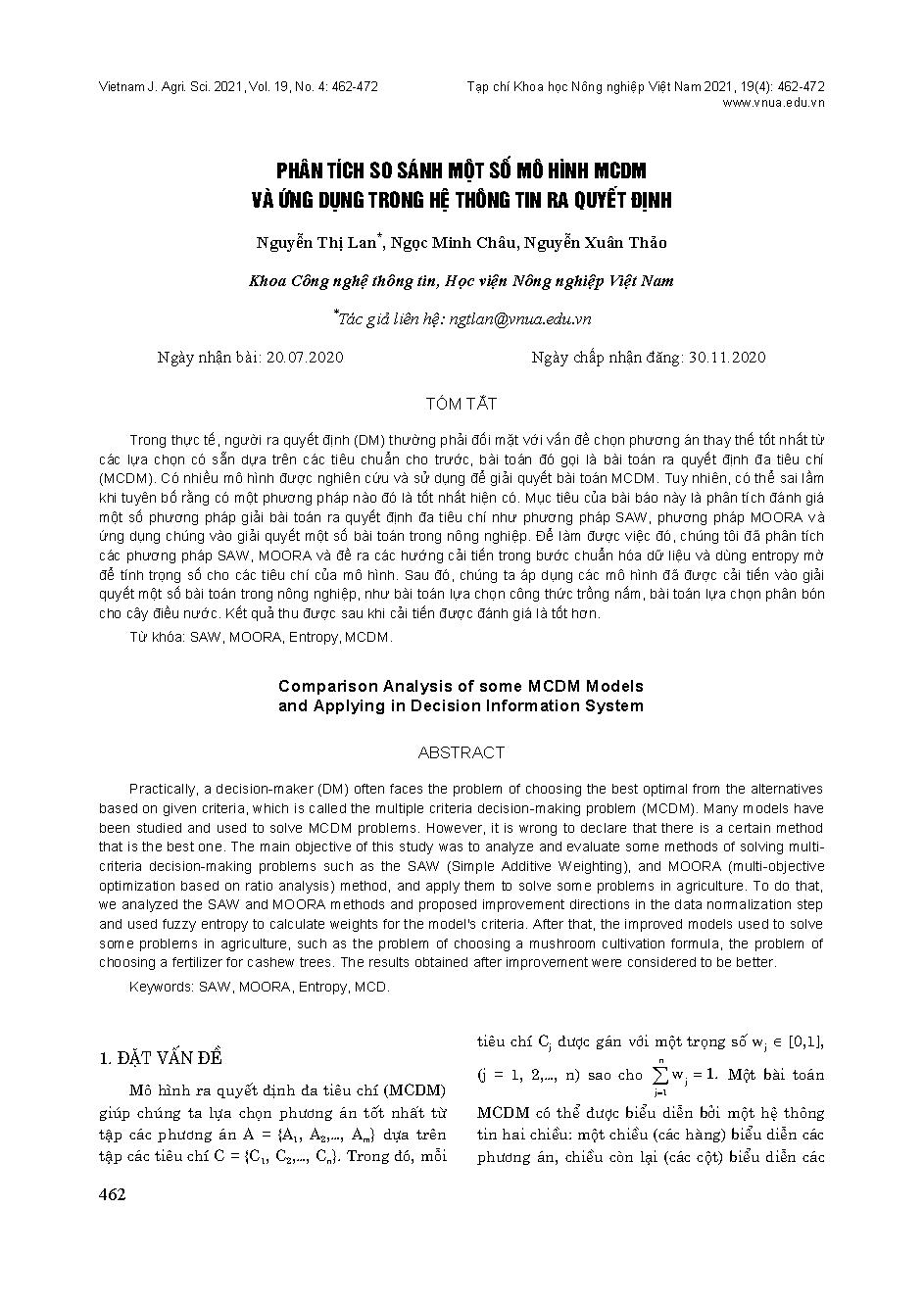 Phân tích so sánh một số mô hình MCDM và ứng dụng trong hệ thông tin ra quyết định = Comparison Analysis of some MCDM Models and Applying in Decision Information System