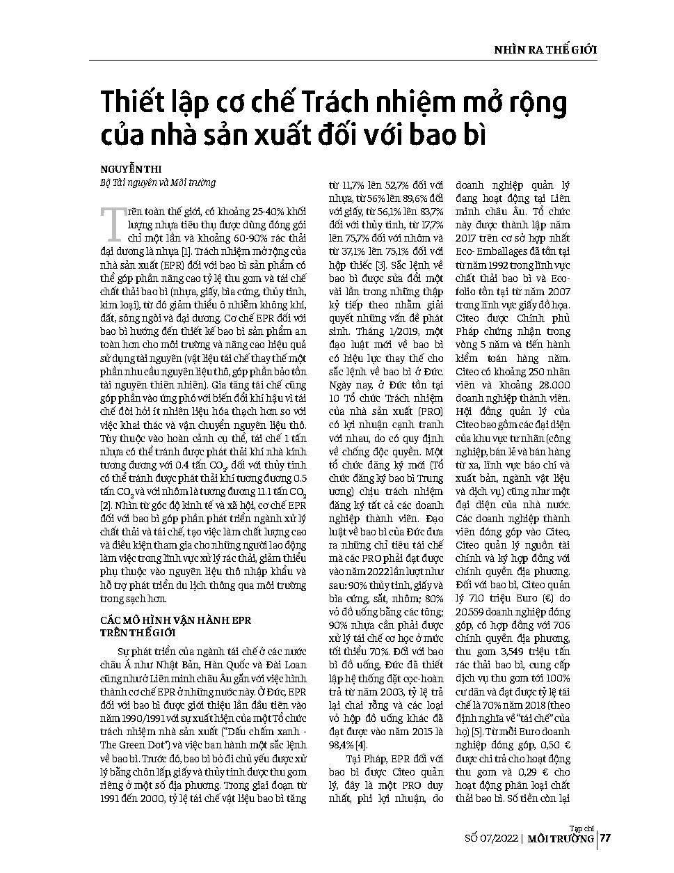 Thiết lập cơ chế Trách nhiệm mở rộng của nhà sản xuất đối với bao bì