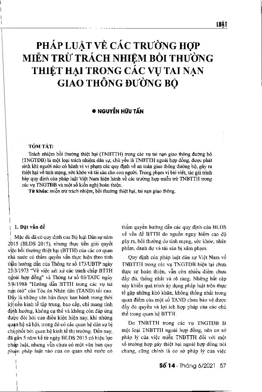Pháp luật về các trường hợp miễn trừ trách nhiệm bồi thường thiệt hại trong các vụ tai nạn giao thông đường bộ = Regulations on exemptions of compensation liabilities for damages in road traffic accident