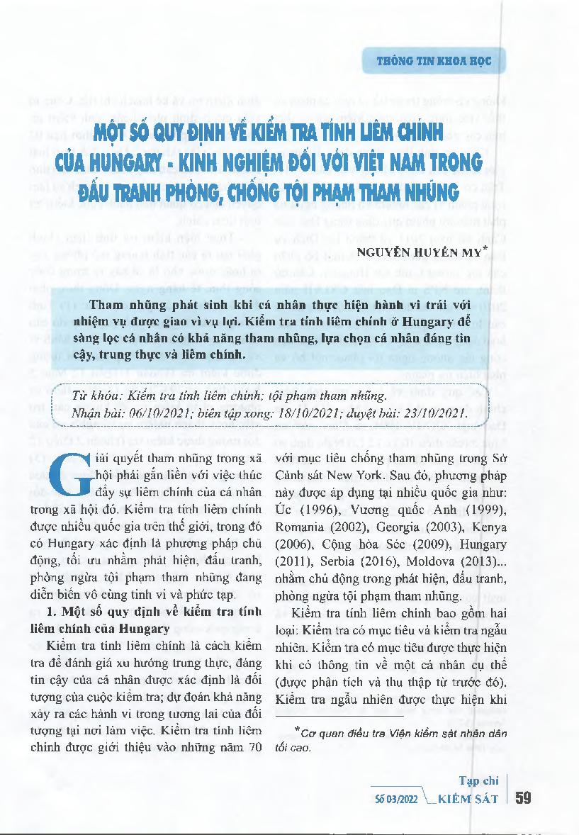 Một số quy định về kiểm tra tính liêm chính của Hungary - Kinh nghiệm đối với Việt Nam trong đấu tranh phòng, chống tội phạm tham nhũng