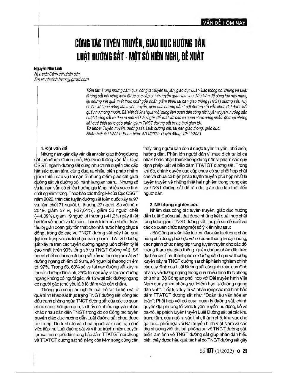 Công tác tuyên truyền, giáo dục hướng dẫn Luật đường sắt - Một số kiến nghị, đề xuất = Propaganda, education and guidance of the Railway Law - Some recommendations