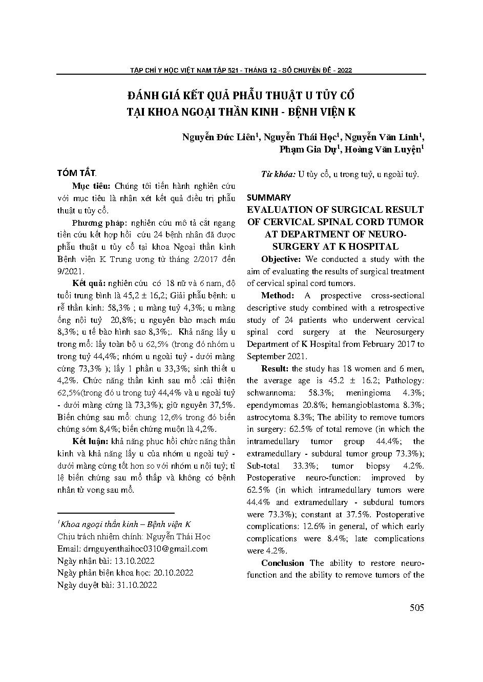 Đánh giá kết quả phẫu thuật u tủy cổ tại khoa ngoại thần kinh - Bệnh viện K = Evaluation of surgical result of cervical spinal cord tumor at department of neurosurgery at K hospital