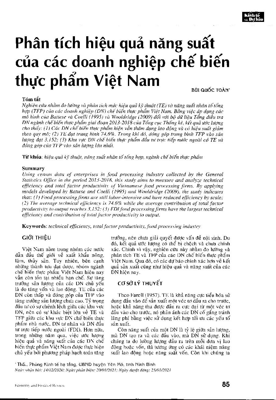 Phân tích hiệu quả năng suất của các doanh nghiệp chế biến thực phẩm Việt Nam. = Analyze technical efficiency and total factor productivity of Vietnamese food processing firms