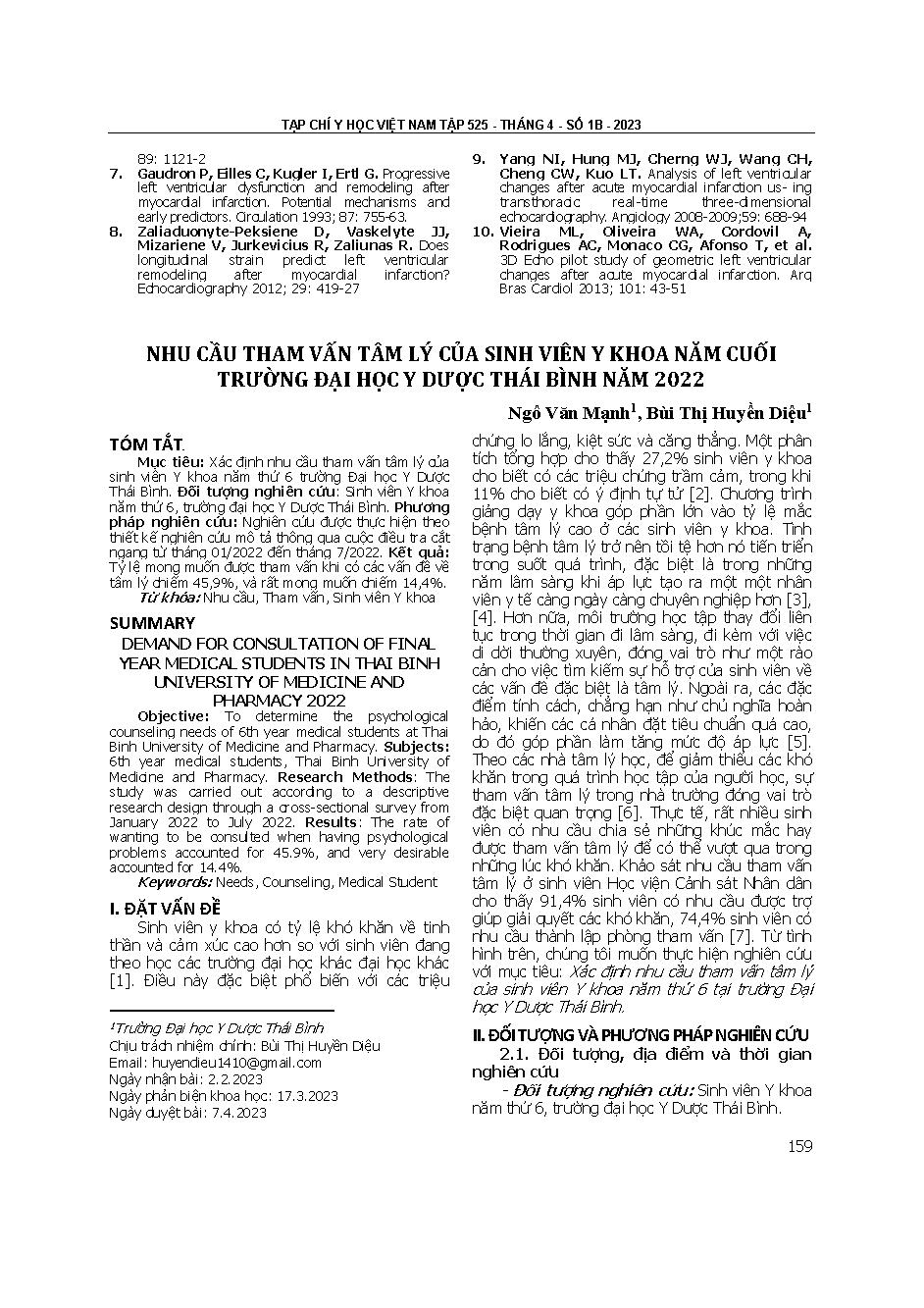 Nhu cầu tham vấn tâm lý của sinh viên y khoa năm cuối Trường Đại học Y dược Thái Bình năm 2022 = Demand for consultation of final year medical students in Thai Binh university of medicine and pharmacy 2022