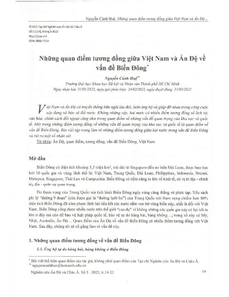 Những quan điểm tương đồng giữa Việt Nam và Ấn Độ về vấn đề Biển Đông = Similar views of Vietnam and India on the East Sea issue