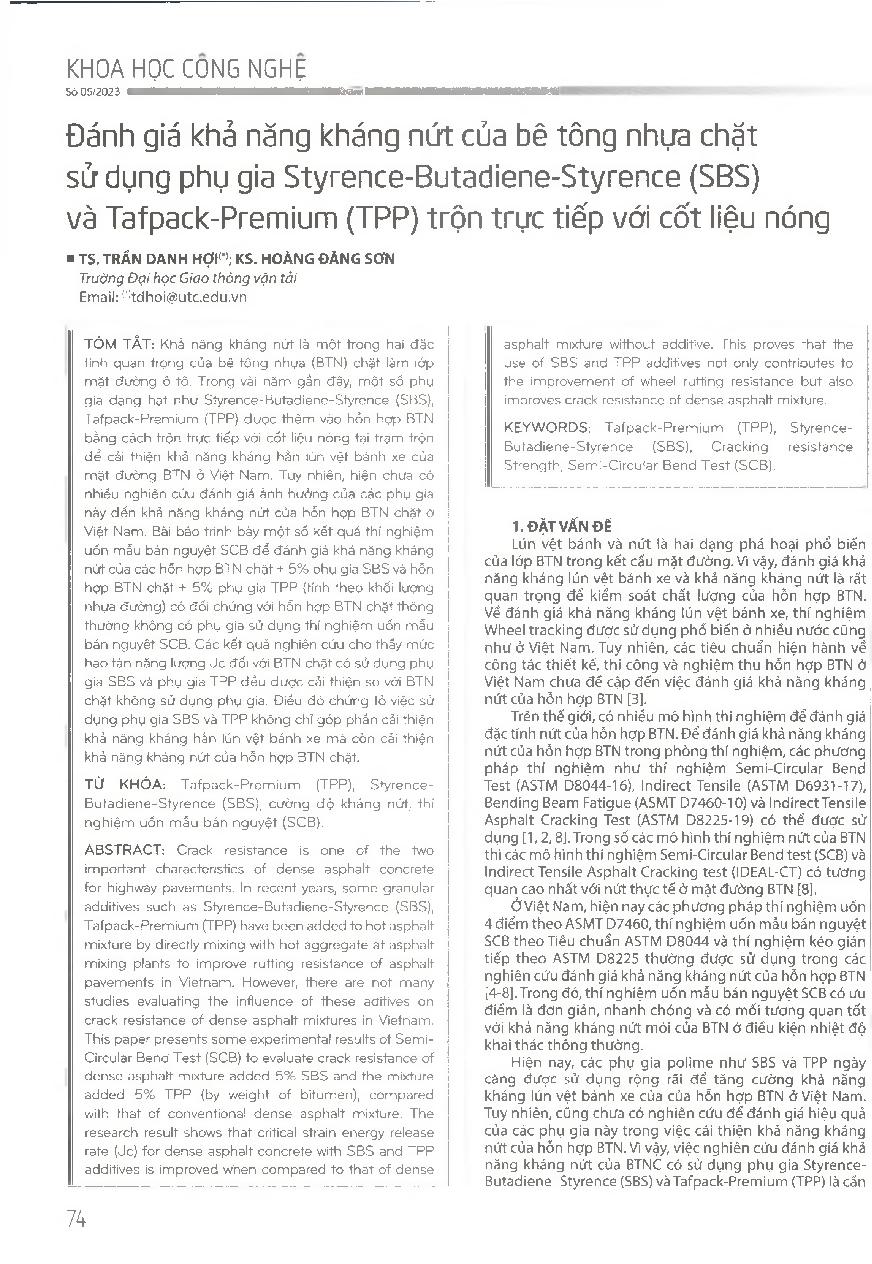 Đánh giá khả năng kháng nứt của bê tông nhựa chặt sử dụng phụ gia Styrence-Butadiene-Styrence (SBS) và Tafpack-Premium (TPP) trộn trực tiếp với cốt liệu nóng = Cracking resistance evaluation of compacted asphalt concrete using Styrence-Butadiene-Styrence