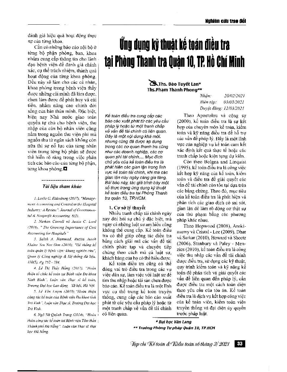 Ứng dụng kỹ thuật kế toán điều tra tại Phòng thanh tra quận 10, TP. Hồ Chí Minh