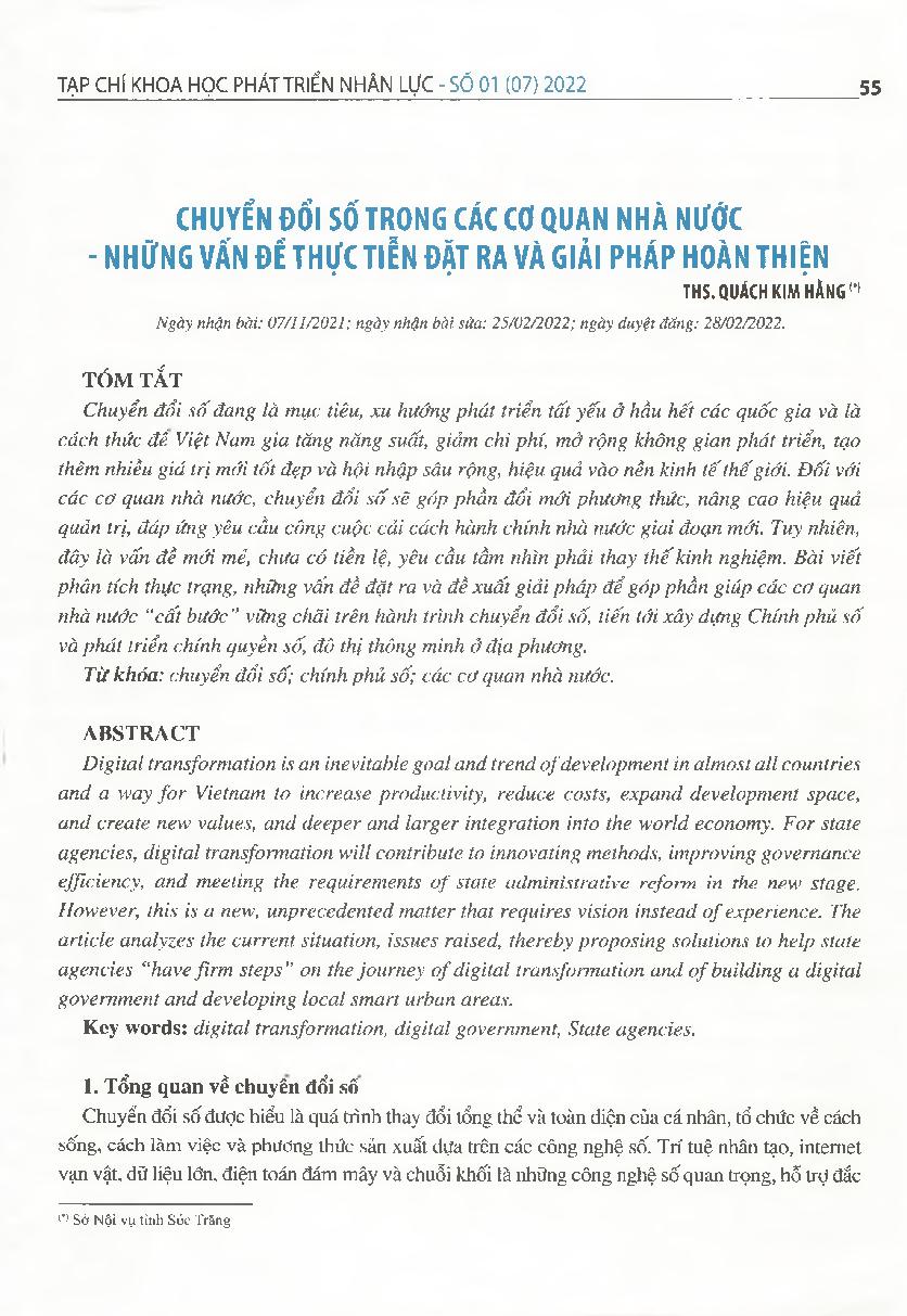 Chuyển đổi số trong các cơ quan nhà nước - những vấn đề thực tiễn đặt ra và giải pháp hoàn thiện = Digital transformation in state agencies - problems arising from the reality and solutions