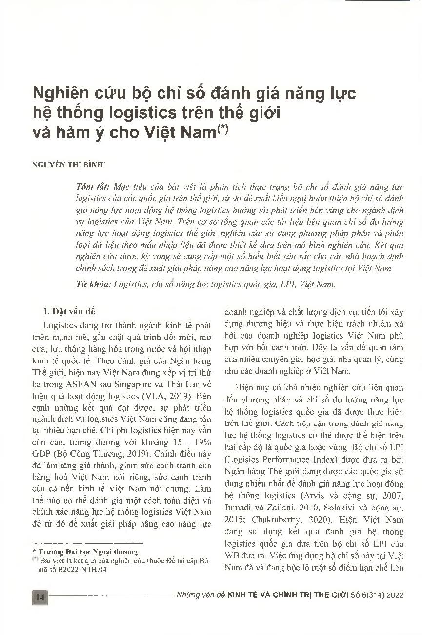Nghiên cứu bộ chỉ sô đánh giá năng lực hệ thống logistics trên thế giới và hàm ý cho Việt Nam = Research on sets of the logistics capacity assessment indexes in the world and its implications for Vietnam