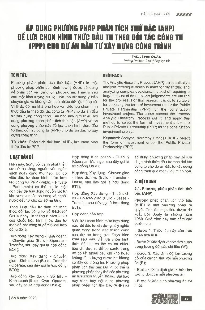 Áp dụng phương pháp phân tích thứ bậc (AHP) để lựa chọn hình thức đầu tư theo đối tác công tư (PPP) cho dự án đầu tư xây dựng công trình